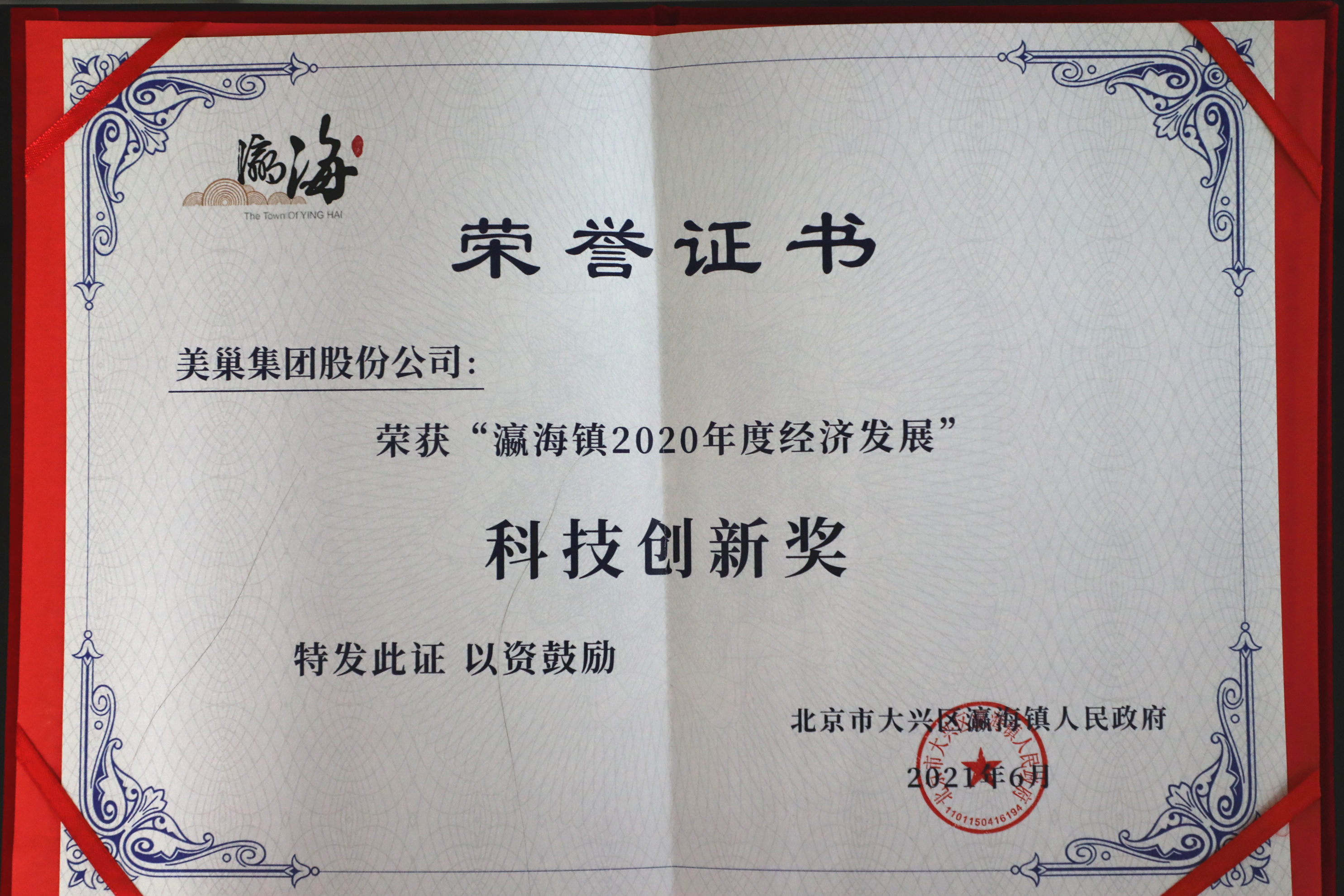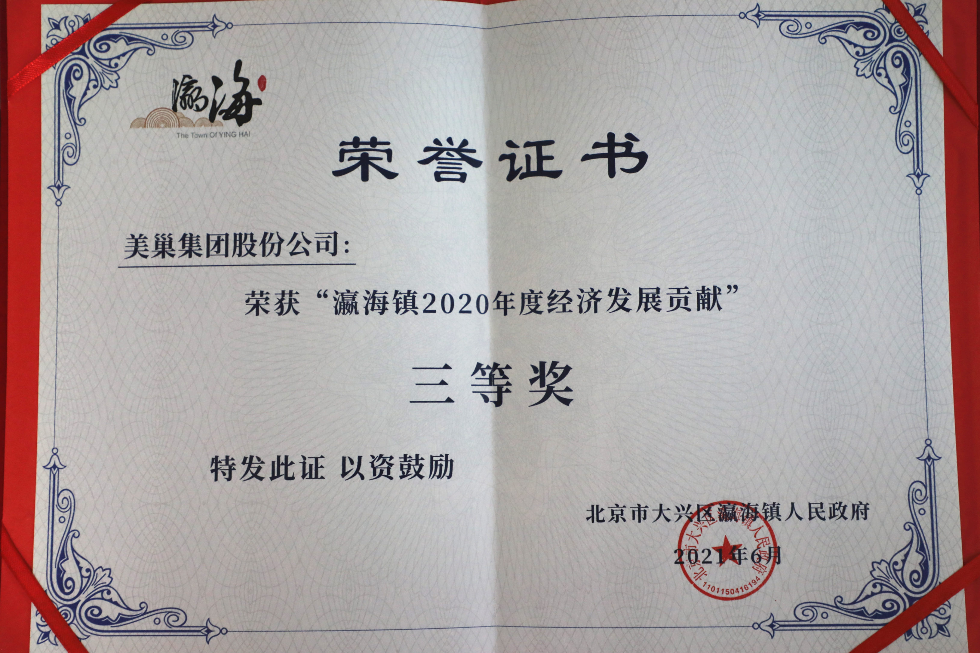 頒發單位:北京市大興區瀛海鎮人民政府