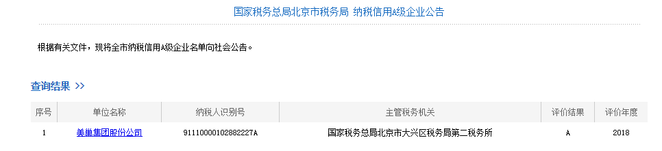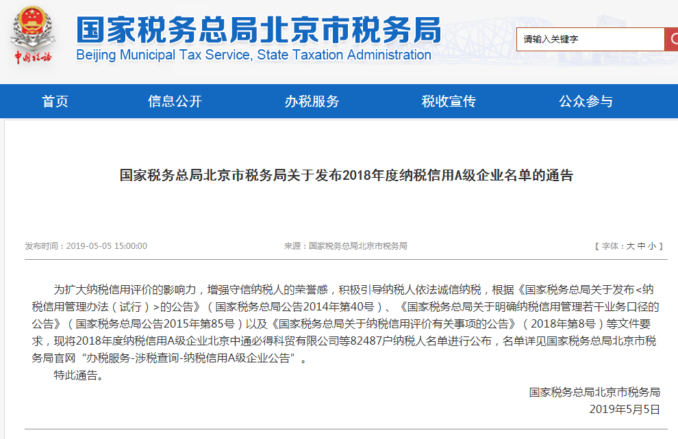 2019年5月5日,為擴大納稅信用評價的影響力,增強守信納稅人的榮譽感,積極引導納稅人依法誠信納稅,國家稅務總局北京市稅務局發布了2018年度納稅信用A級企業名單。