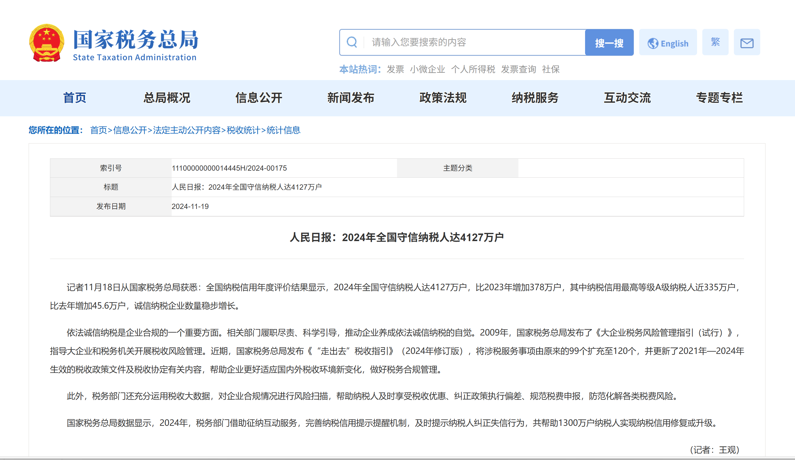 截圖為國家稅務總局官網統計信息